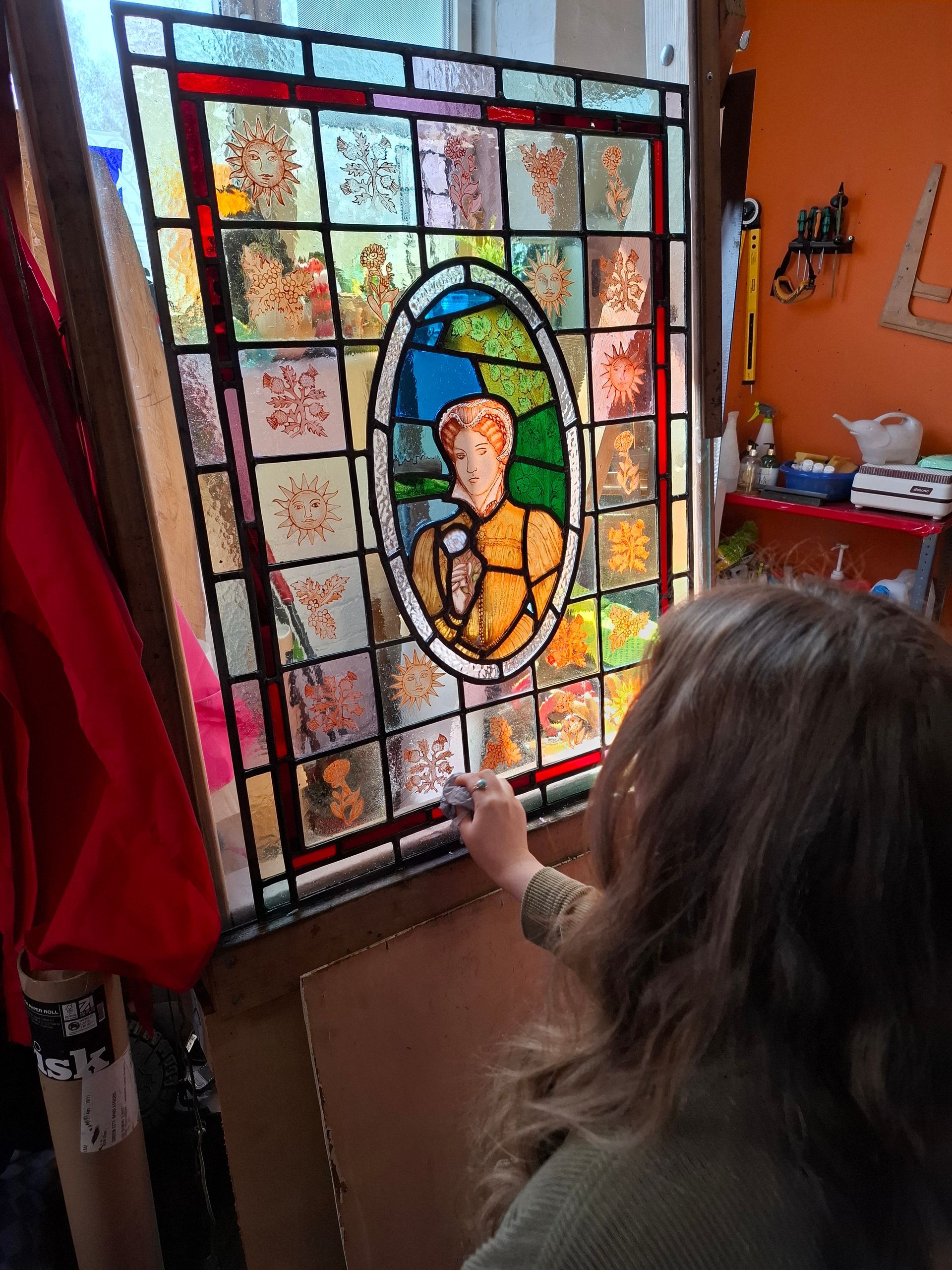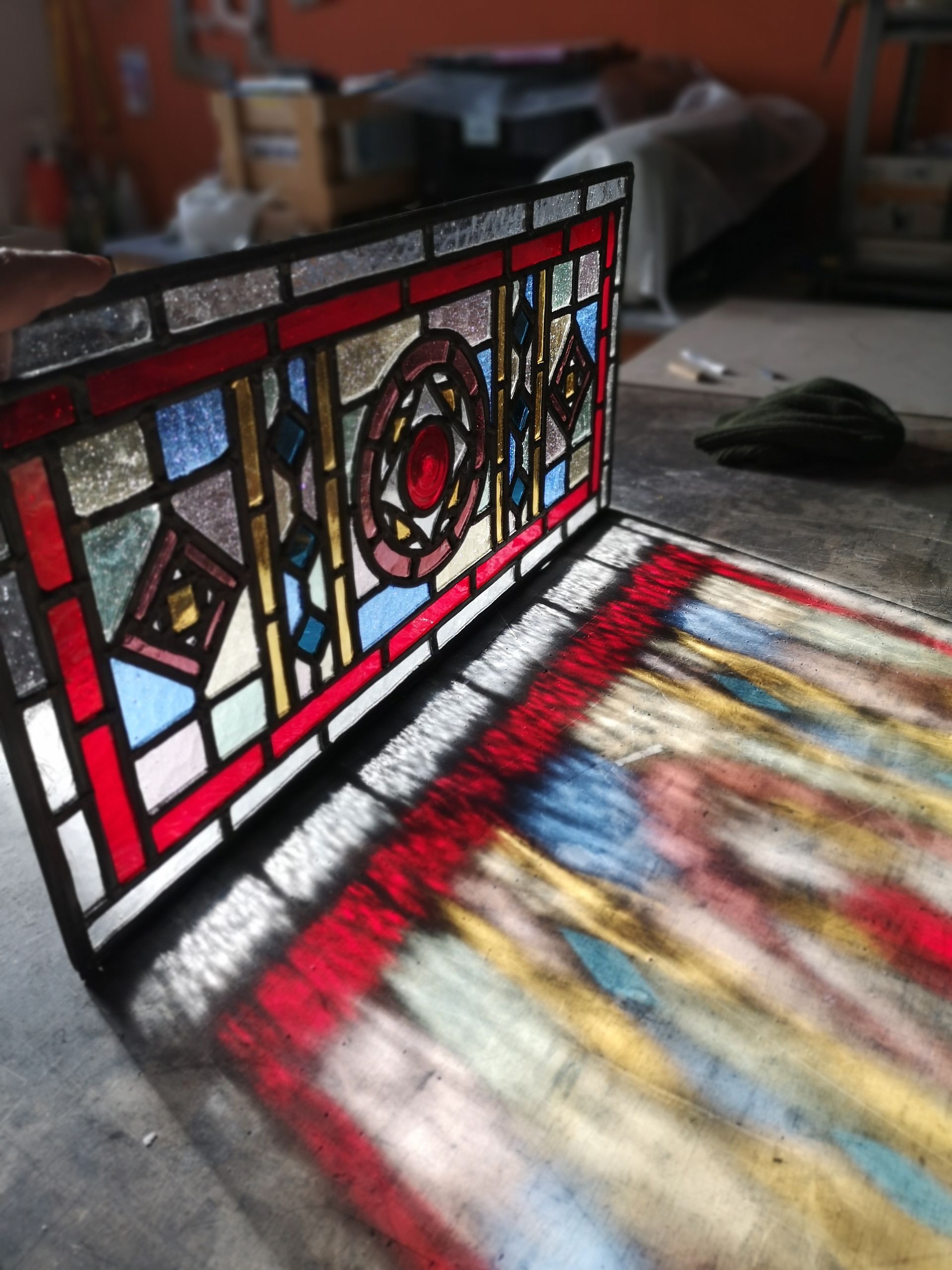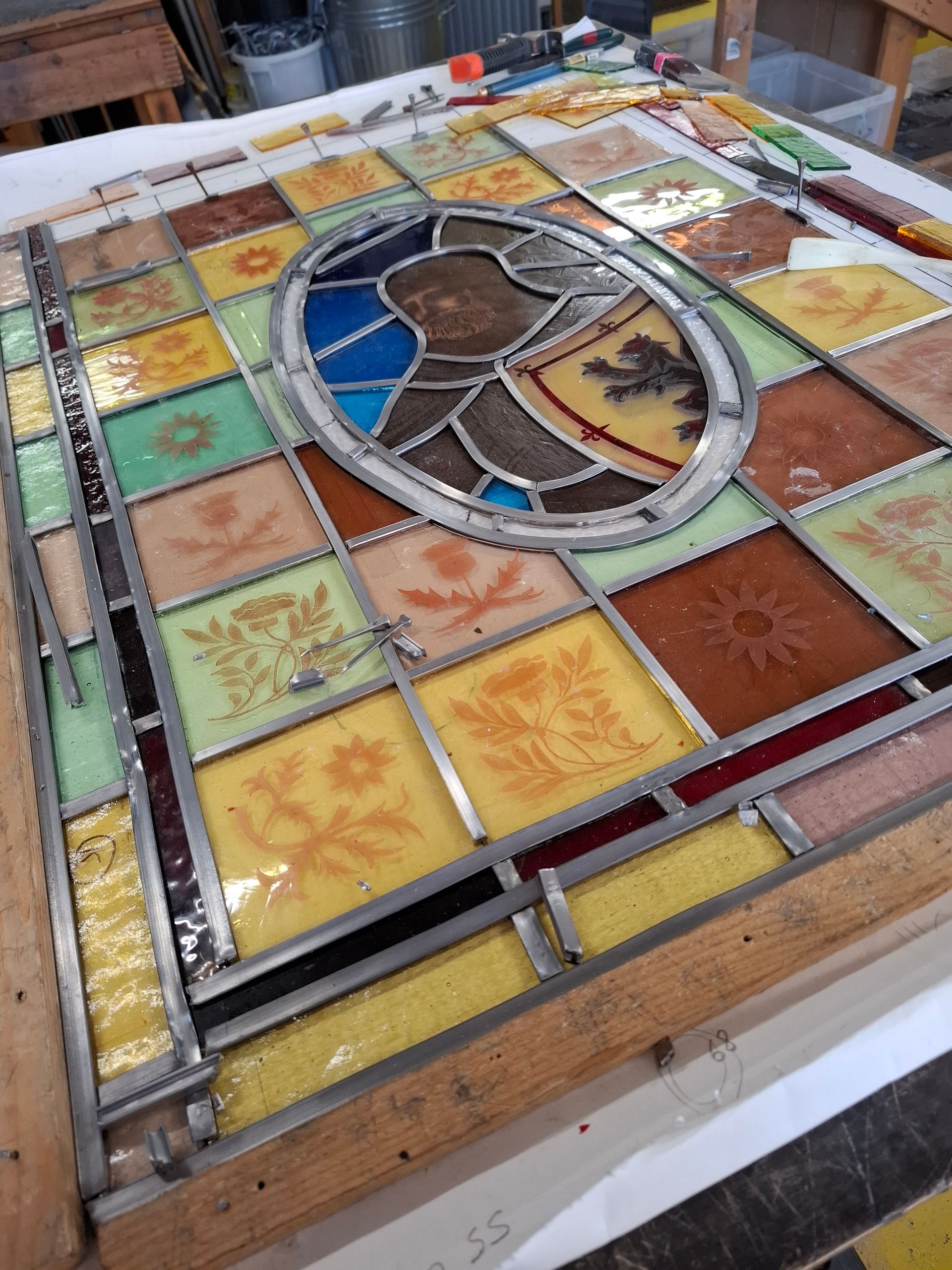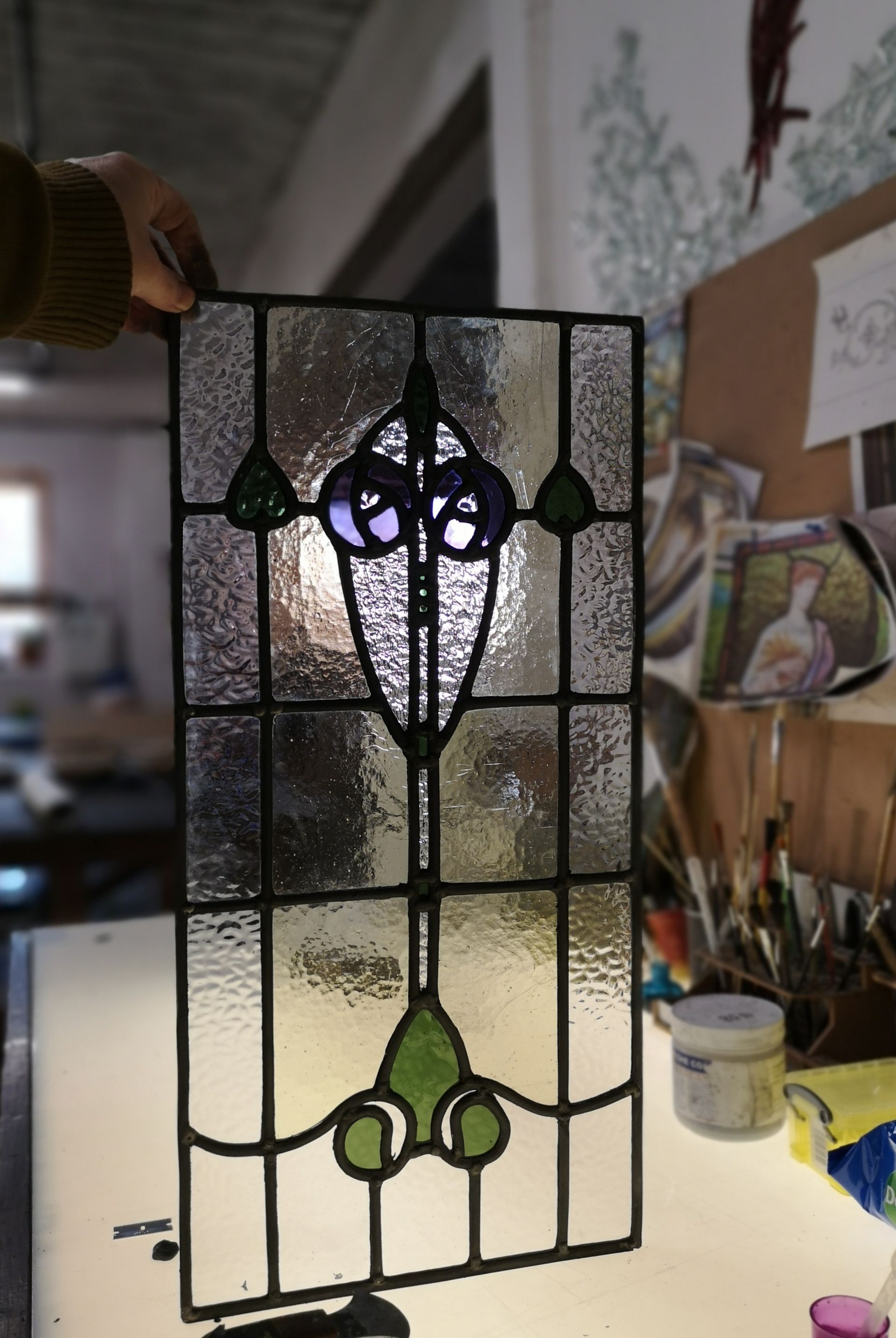 A reproduction of an early 20th century stained glass window. The bathroom window had cracked and some of the enamels (colours) had faded. A poor firing, too low temperatures, mixed with unstable elements (like borax), localised environmental factors and/or abrasive cleaners can lead to paint loss. Glasgow, Scotland.