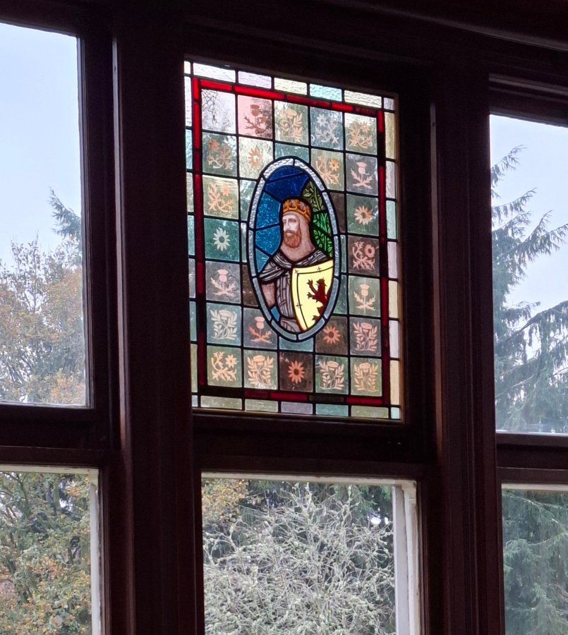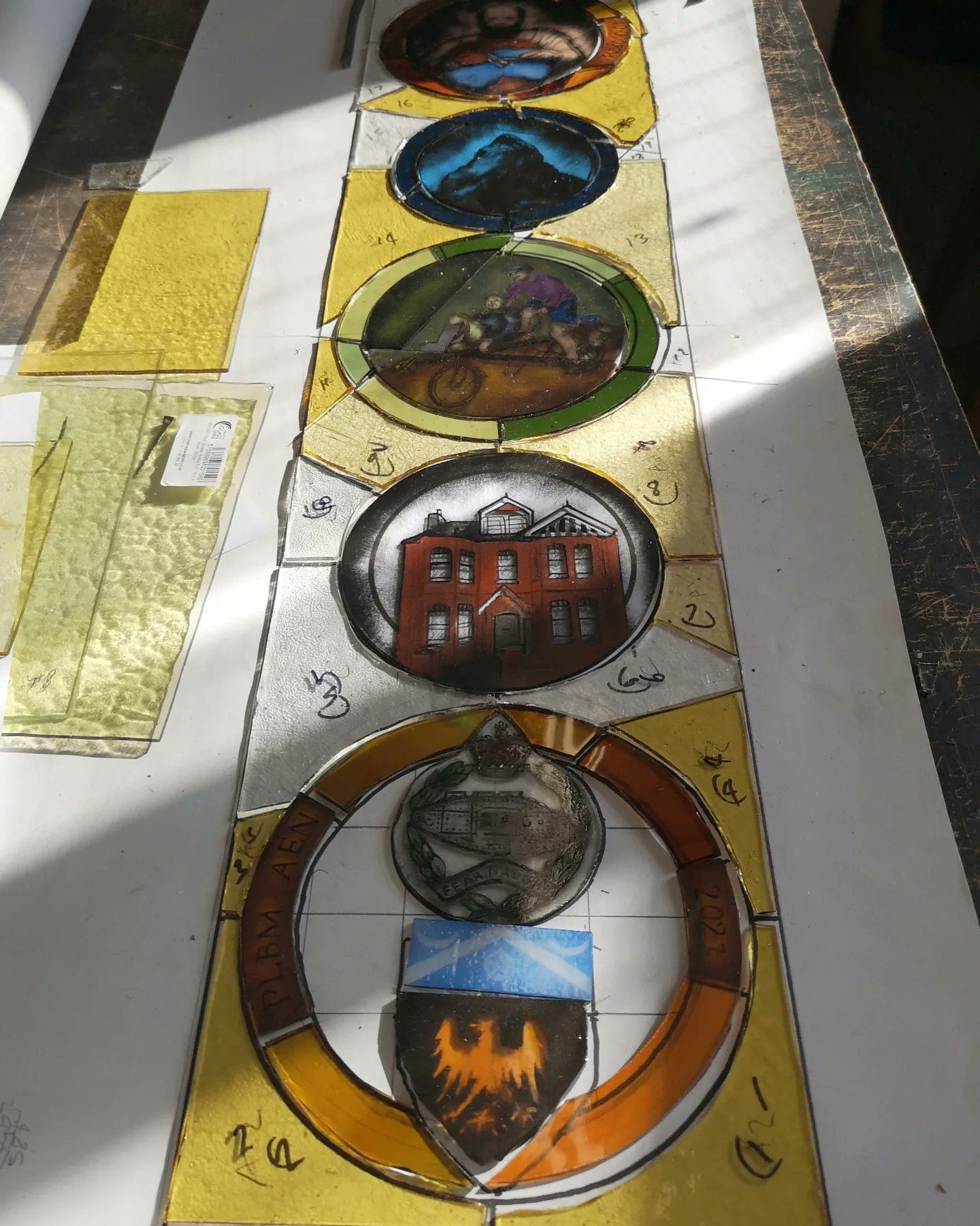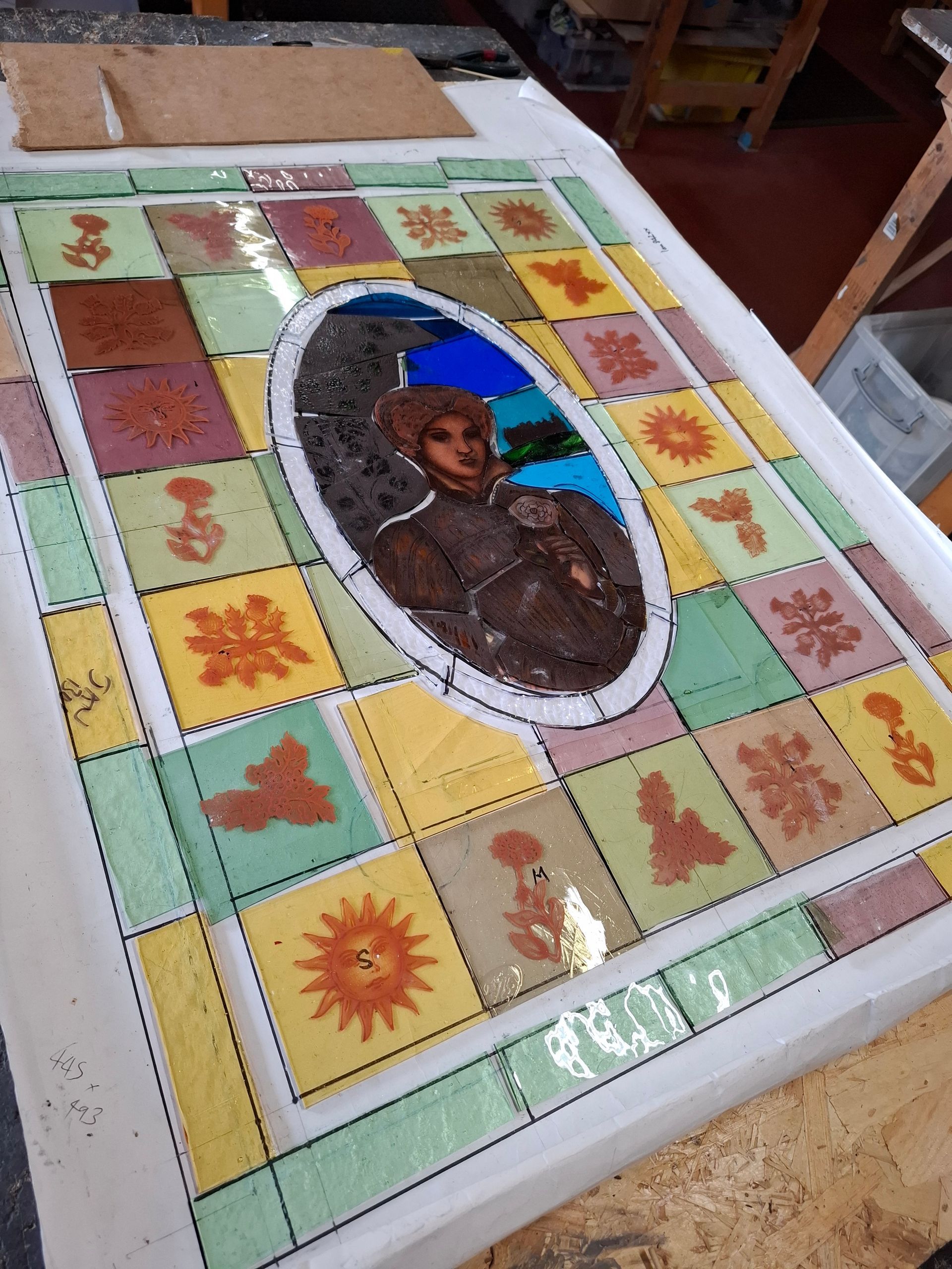A new Mary Queen of Scots stained glass window for this Glasgow home. Background squares used designs from her embroidery work. (When incarcerated she used her embroidery to communicate with those outside). Linlithgow Palace (her birthplace) in the main design and a Hawthorn tree. She holds the white rose of Scotland. The figure of Mary was from a William Morris/ Edward Burne Jones window in Dundee used as the template.