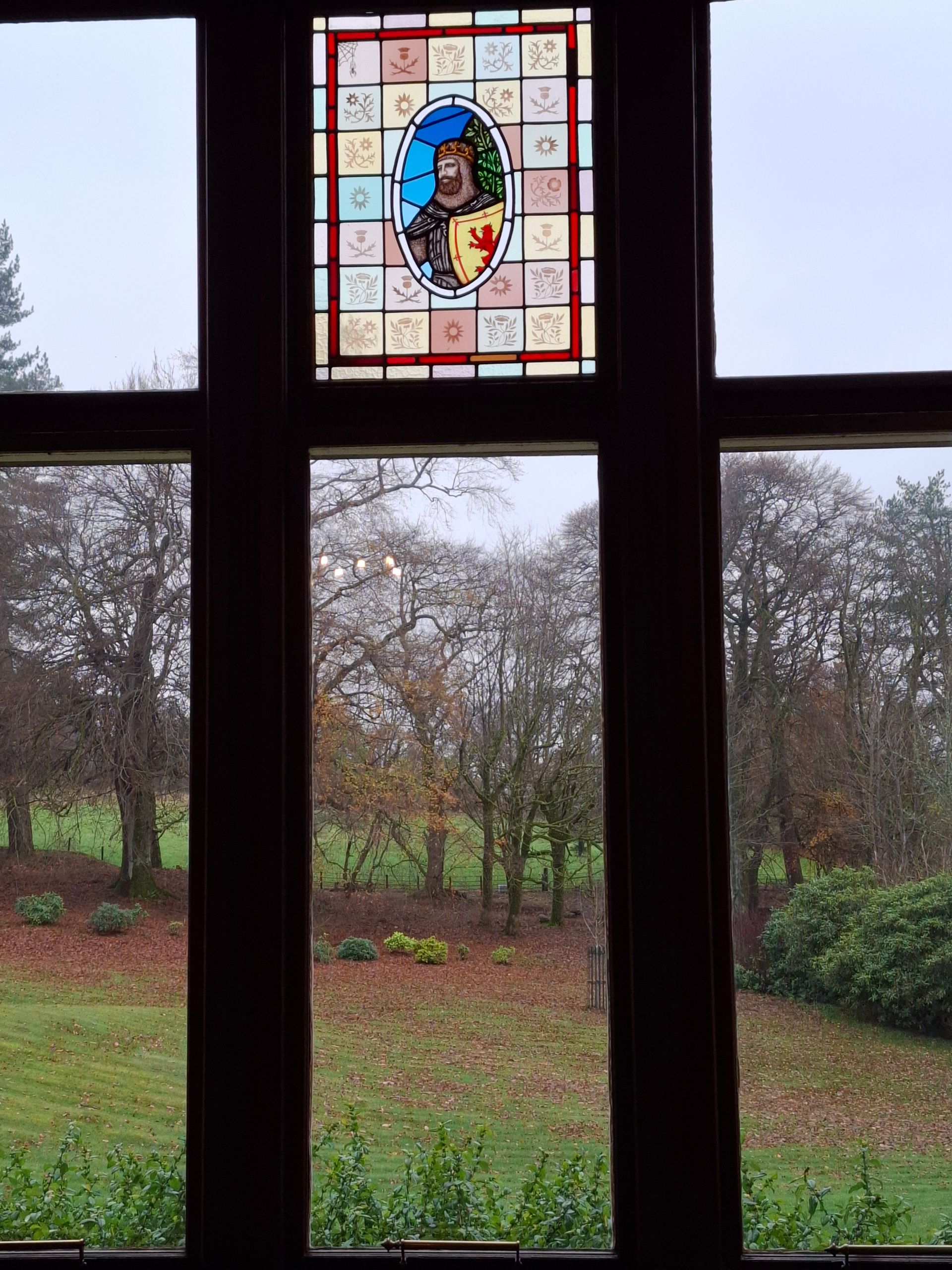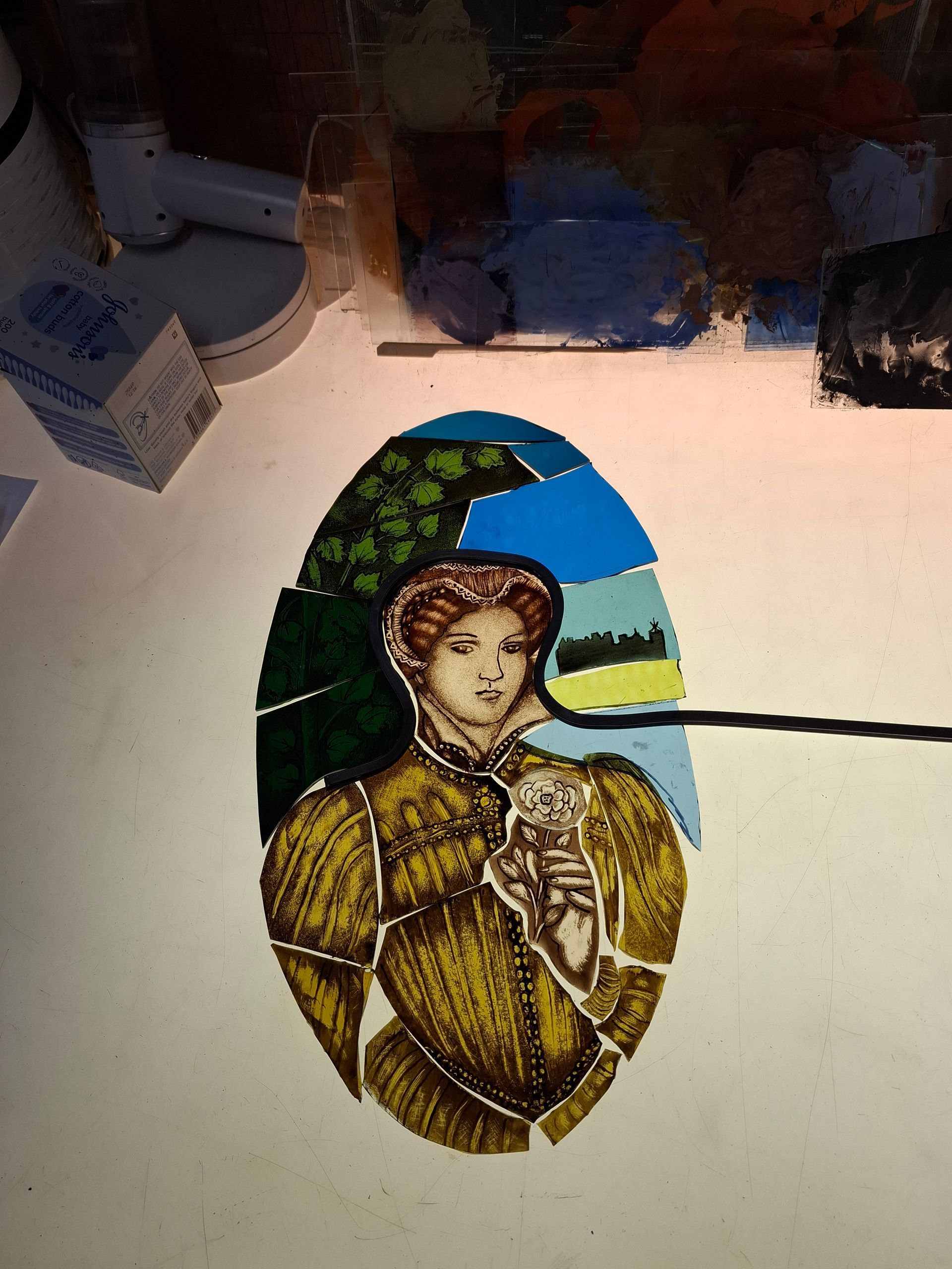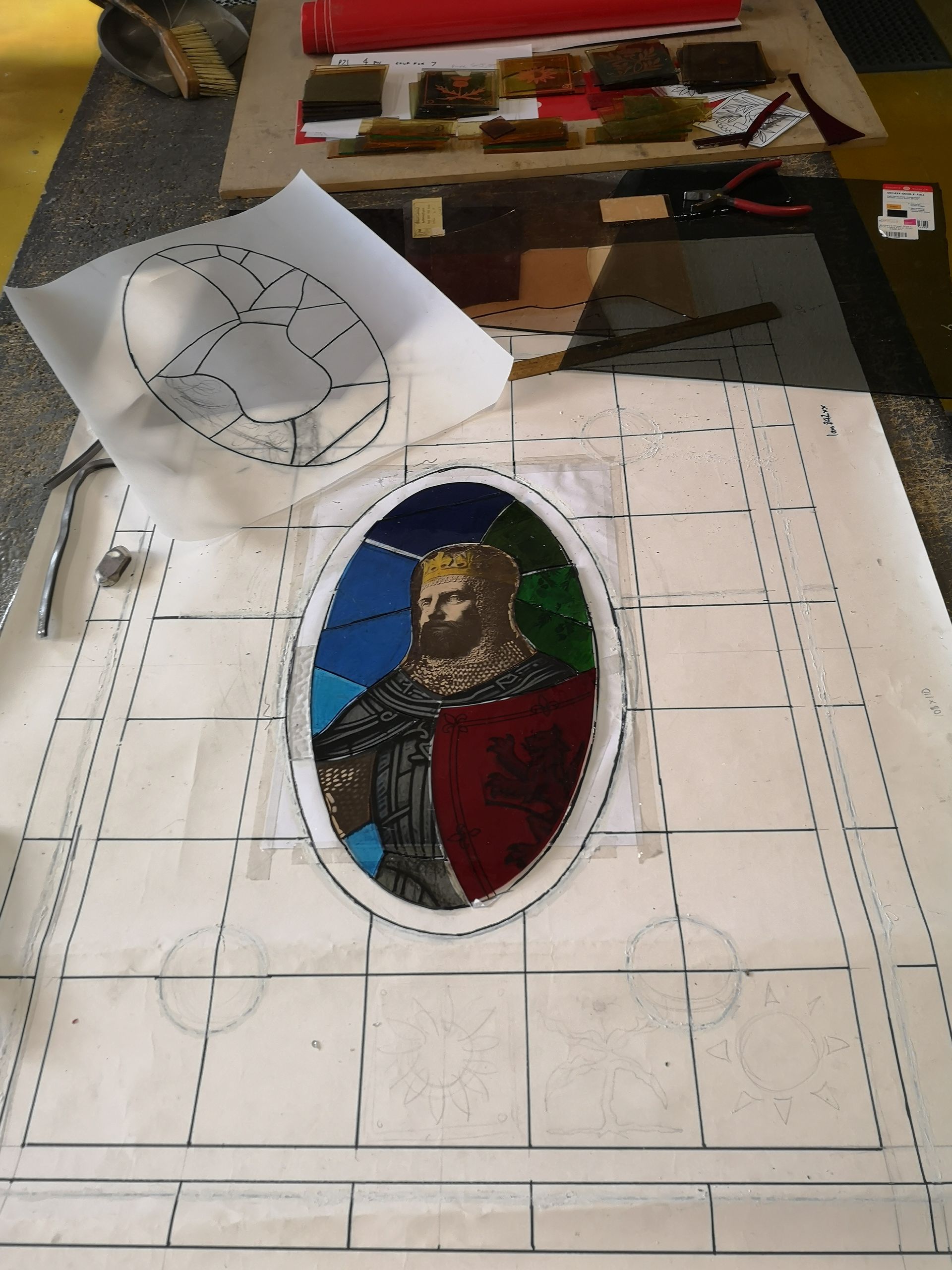 A new Mary Queen of Scots stained glass window for this Glasgow home. Background squares used designs from her embroidery work. (When incarcerated she used her embroidery to communicate with those outside). Linlithgow Palace (her birthplace) in the main design and a Hawthorn tree. She holds the white rose of Scotland. The figure of Mary was from a William Morris/ Edward Burne Jones window in Dundee used as the template.