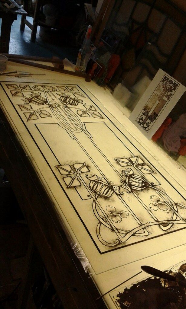 Glass Painting: Our traditional kiln fired glass painting techniques add line, tone, and texture to your glass, creating intricate images and decorative details.