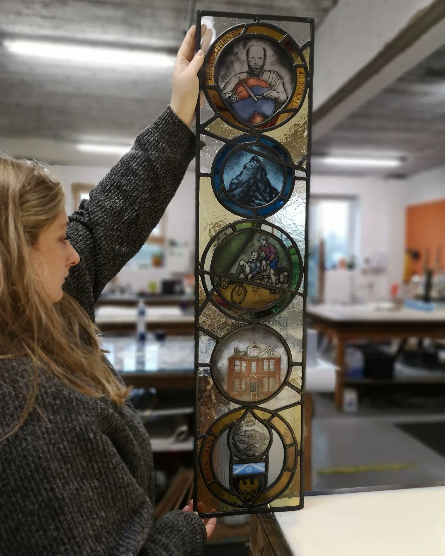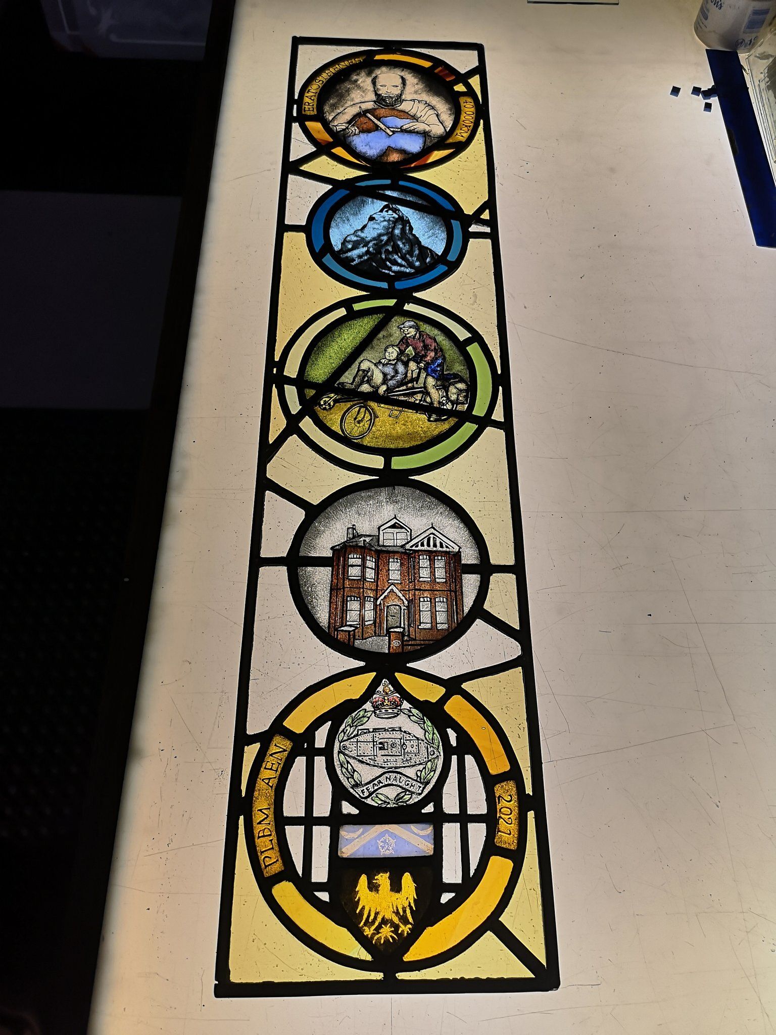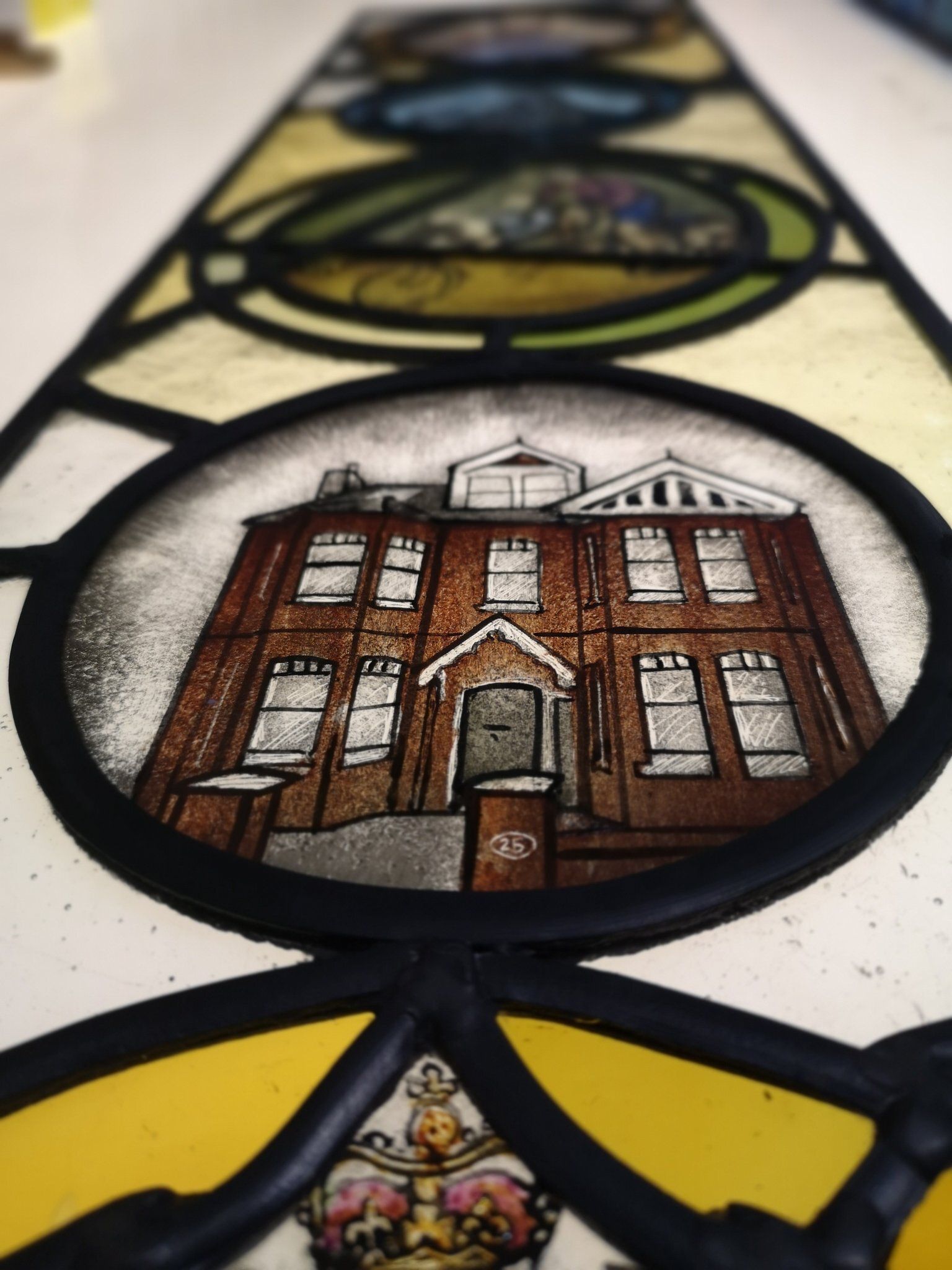 A new kiln fired painted stained glass window to match similar in a hall landing window. Newcastle, England.