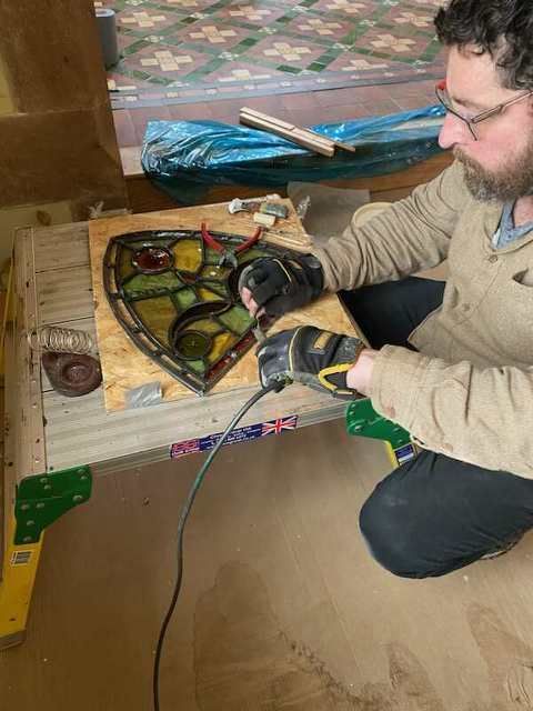 Wee Spug and Apple Blossom. An 11 panel front door window with a central roundel. Chipping out the old plain glass and concrete like putty for 11 panes was fun! Milnathort, Kinross.