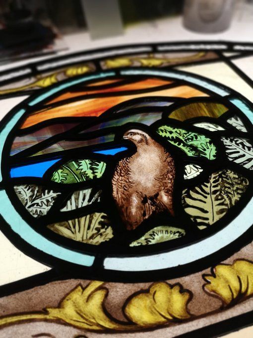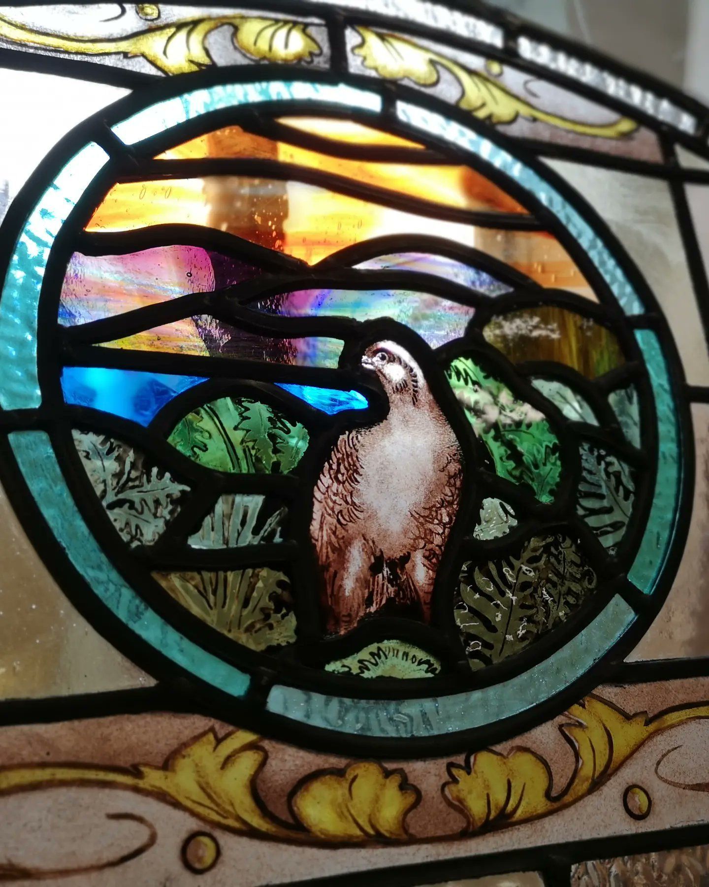 An arched transom stained glass window depicting a grouse set within heather and the Scottish hills. Glasgow, Scotland.