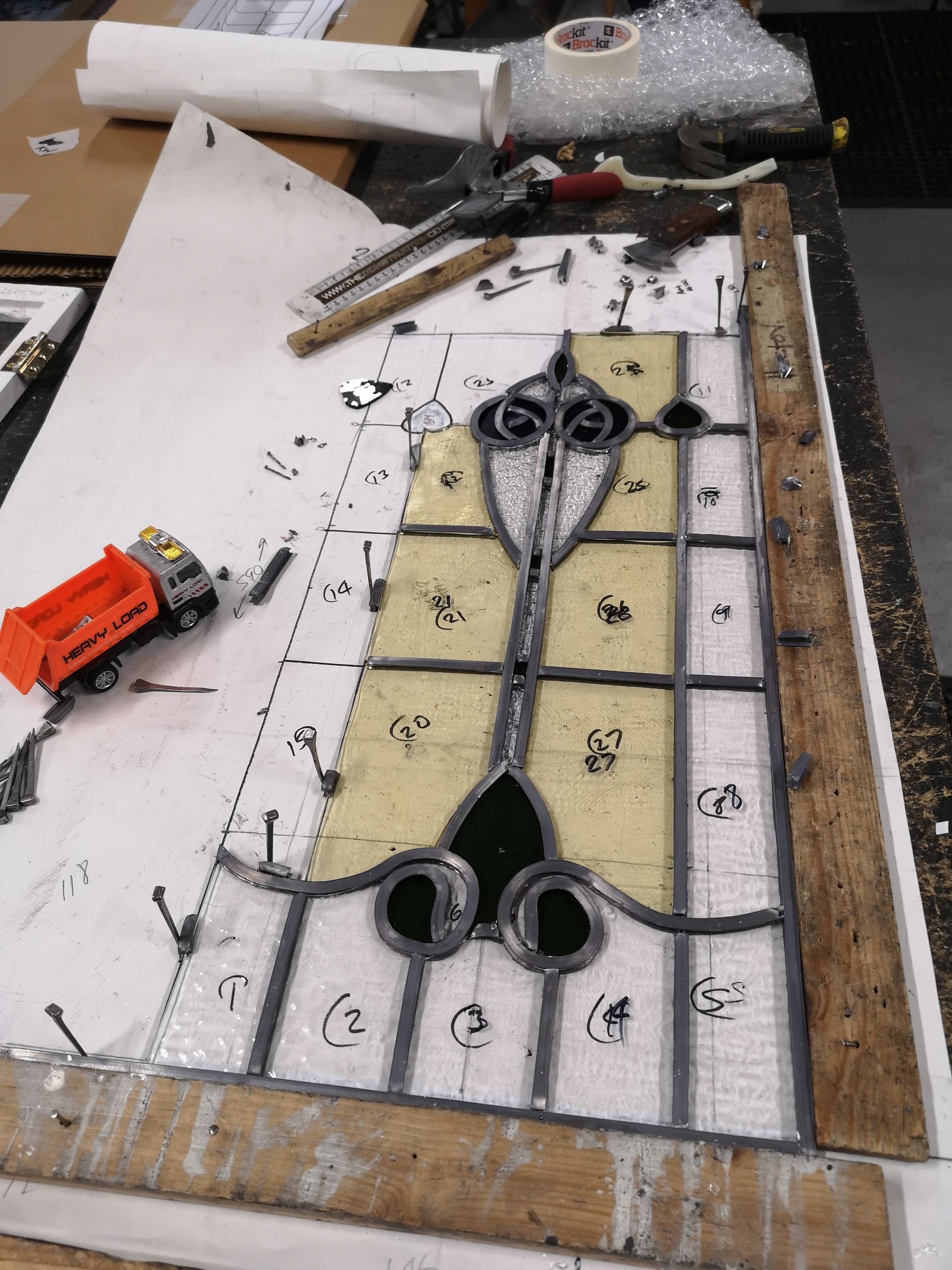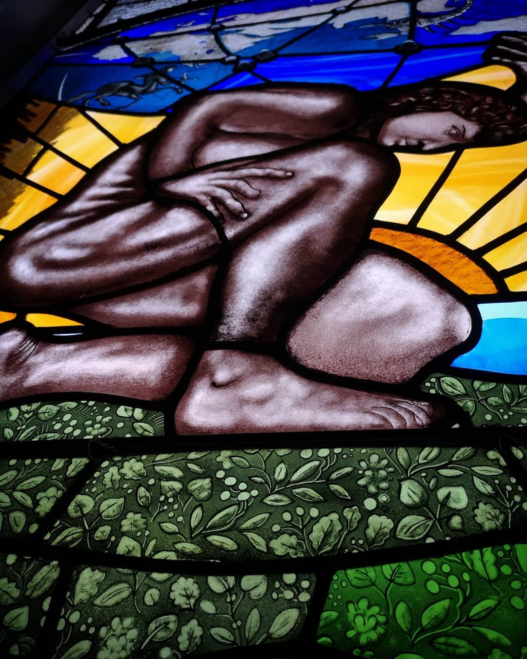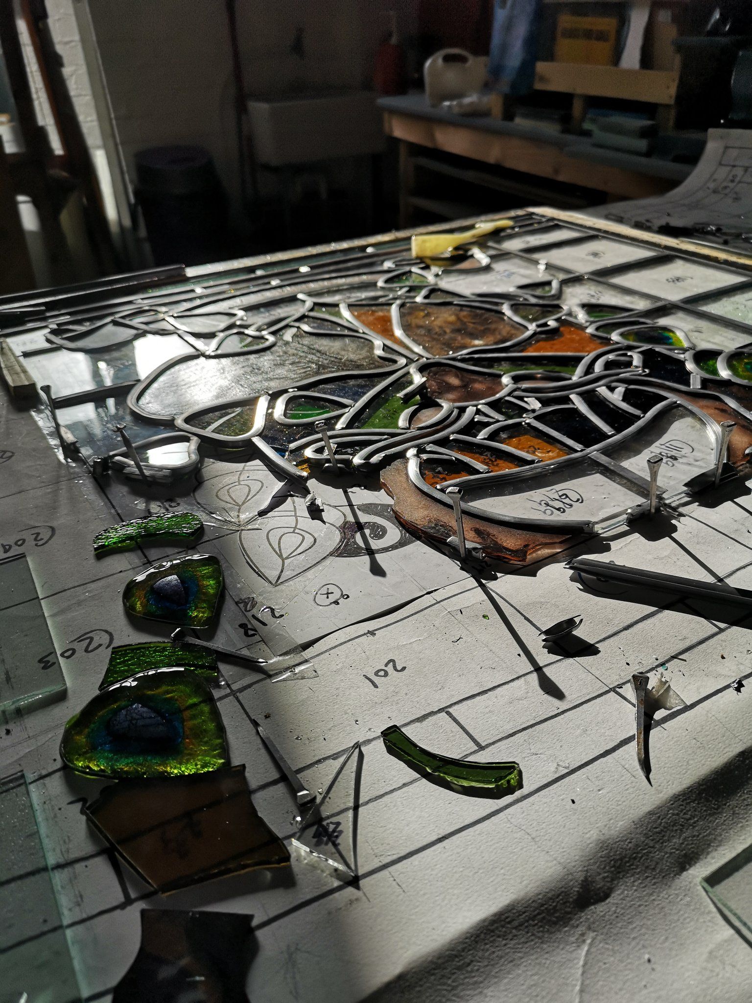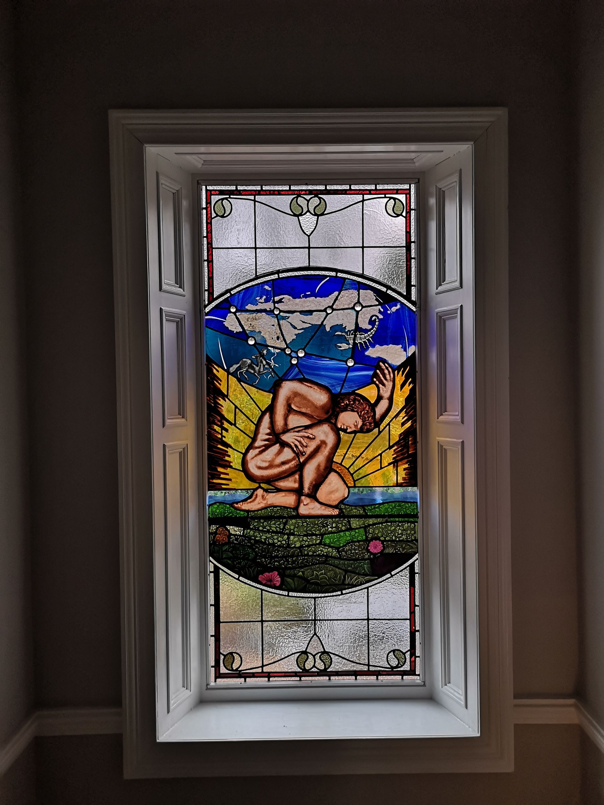 A new stained glass window designed to complement an Andy Scott sculpture for this stairway landing window. Paisley, Scotland. 1m x 3m.