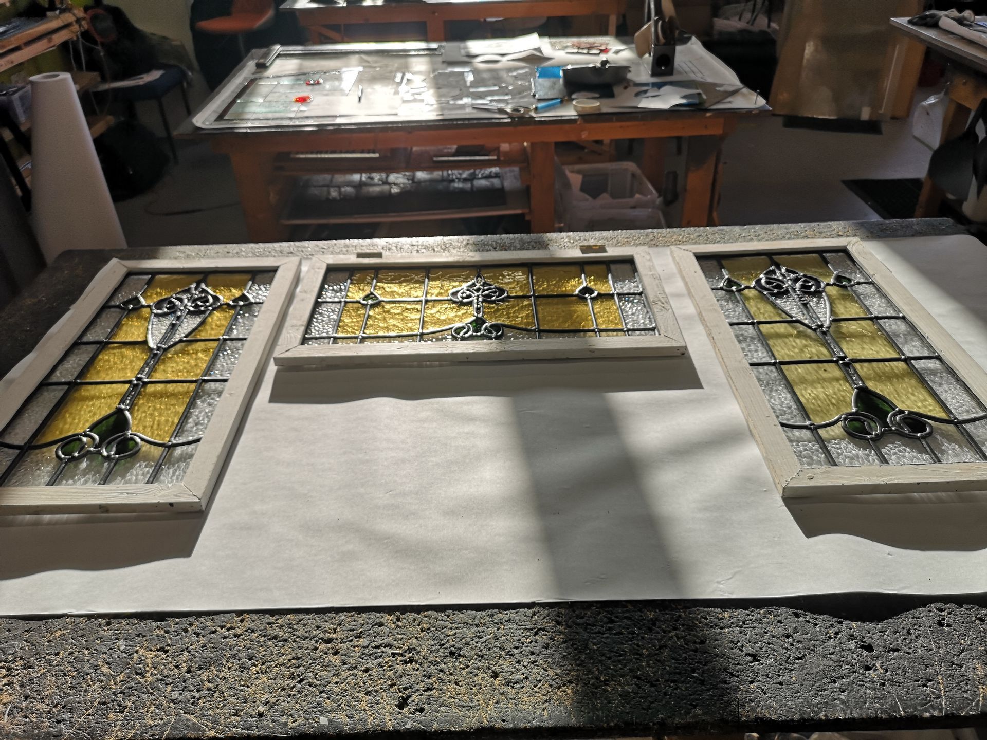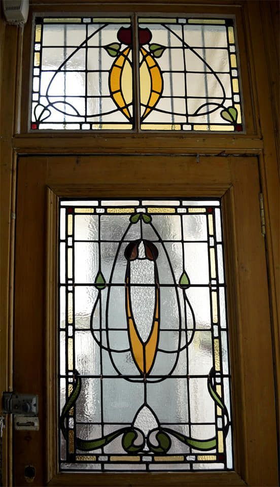 Edwardian styled geometric patterned leaded glass inserts for an entrance door