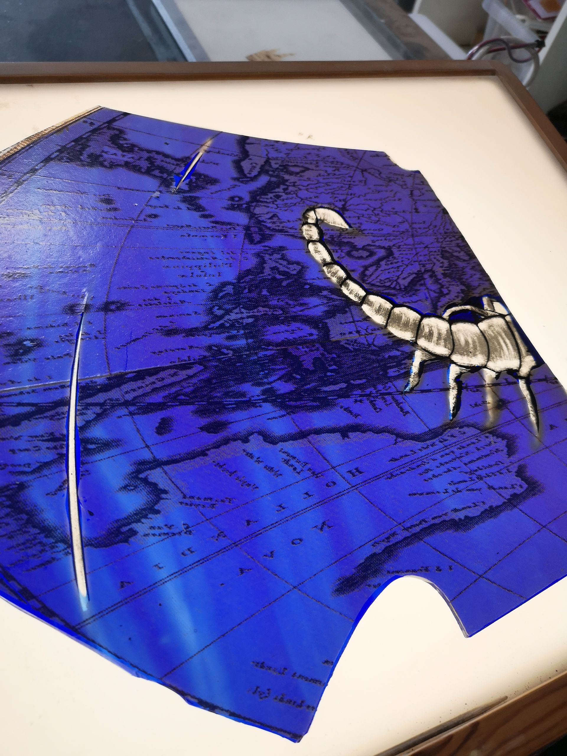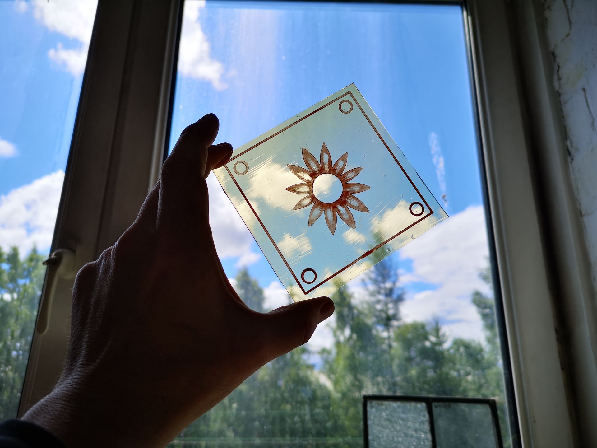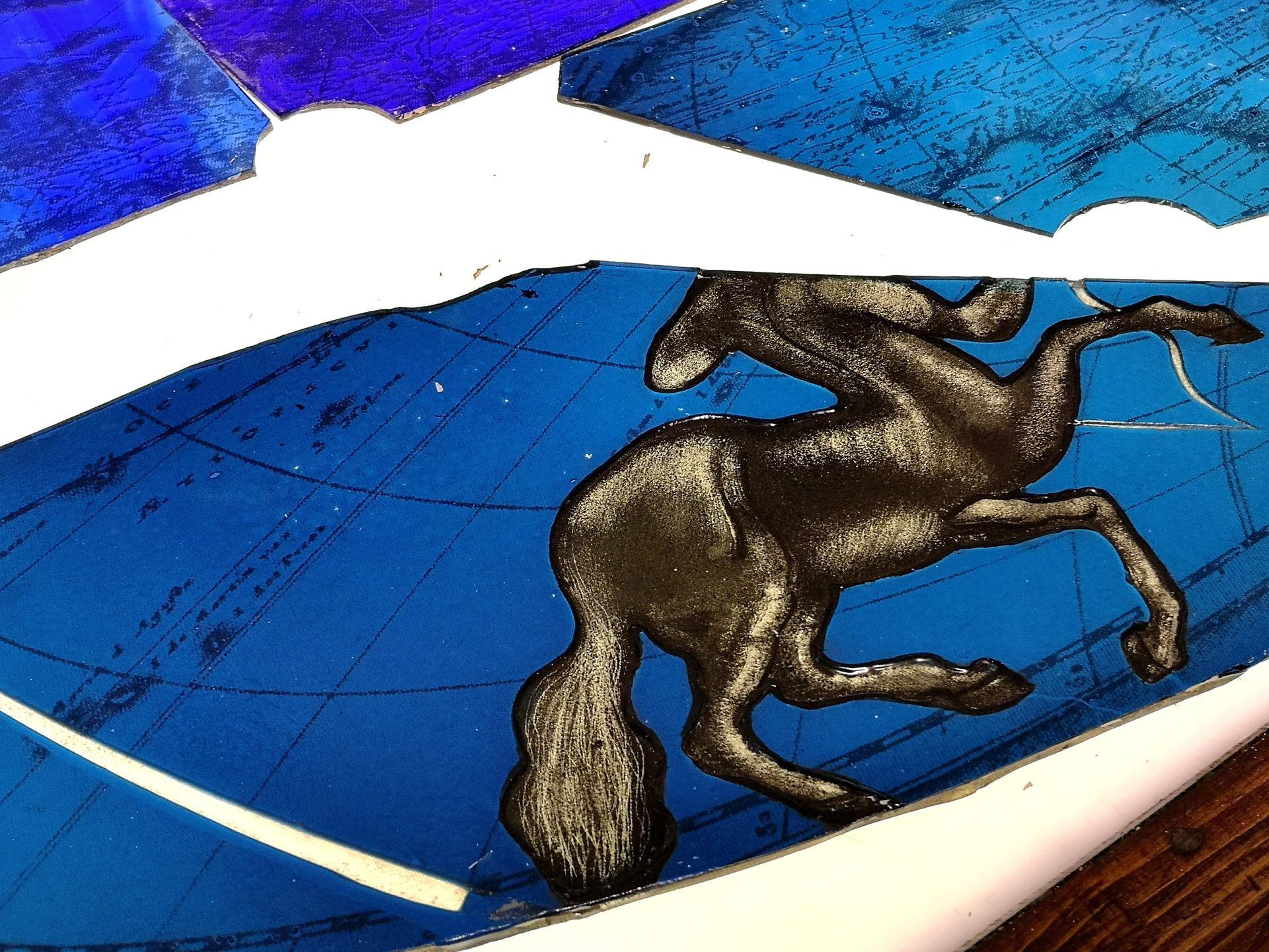 This griffin required 4 seperate kiln firings. The trace line (the outline of the image) is the first firing. The second stage is the shading. Next would be the enamel (the colour) and then finally the silver stain (The amber colour). More firings can be made at each stage depending on the detail and/or the amount of colour required.