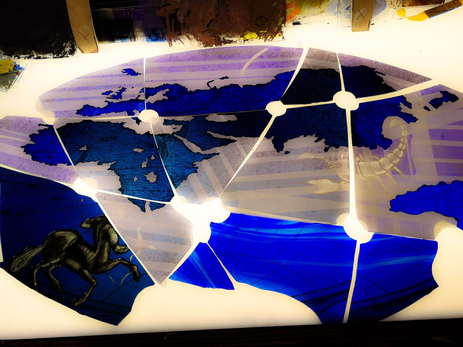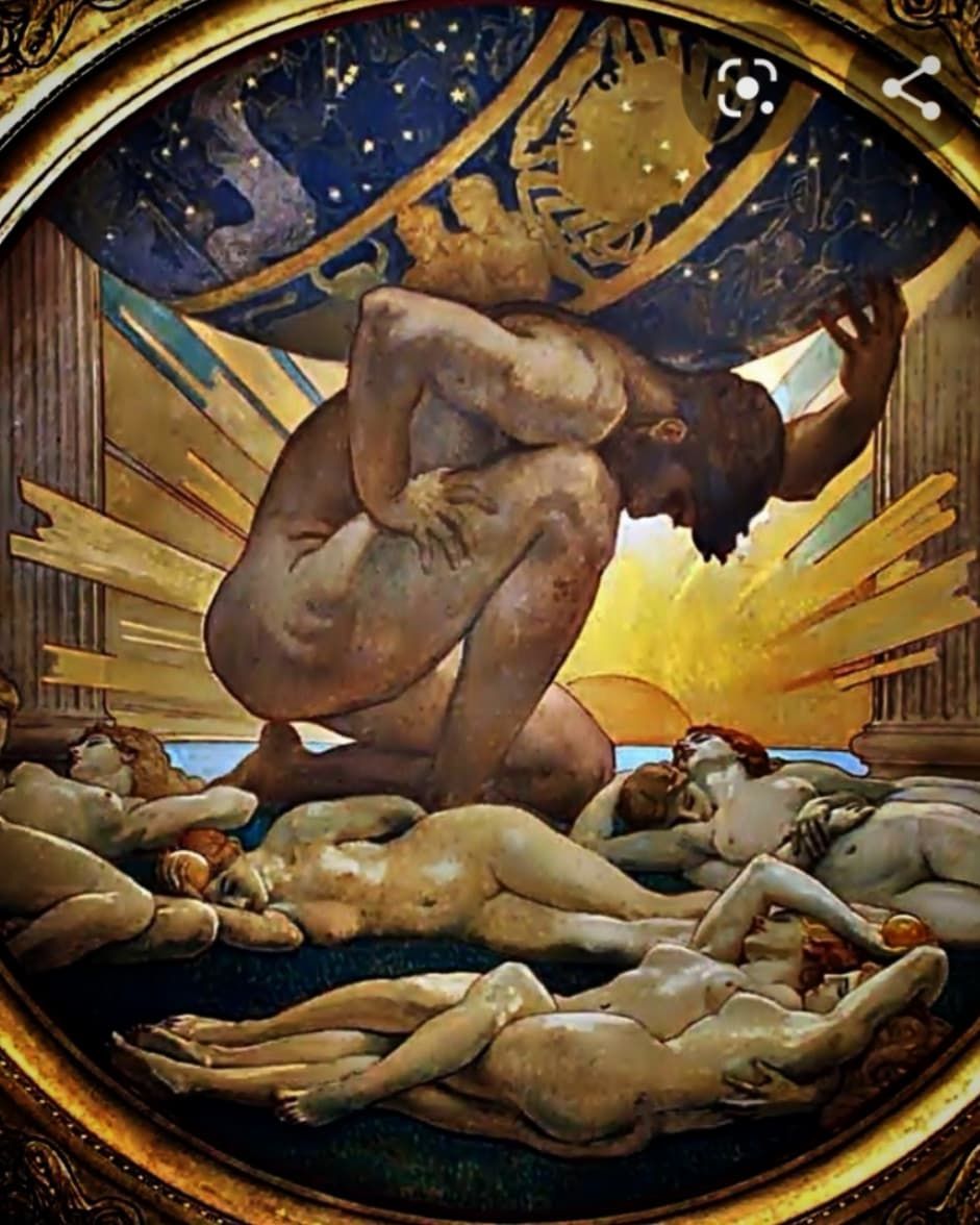 Atlas. A hall landing stained glass window incorporating an image of the Greek God Atlas based on a painting by John Singer Sargent (1856-1925). The window also includes old world maps, the constellations and symbols of Scorpio Sagittaurus. Pollokshields. Glasgow.