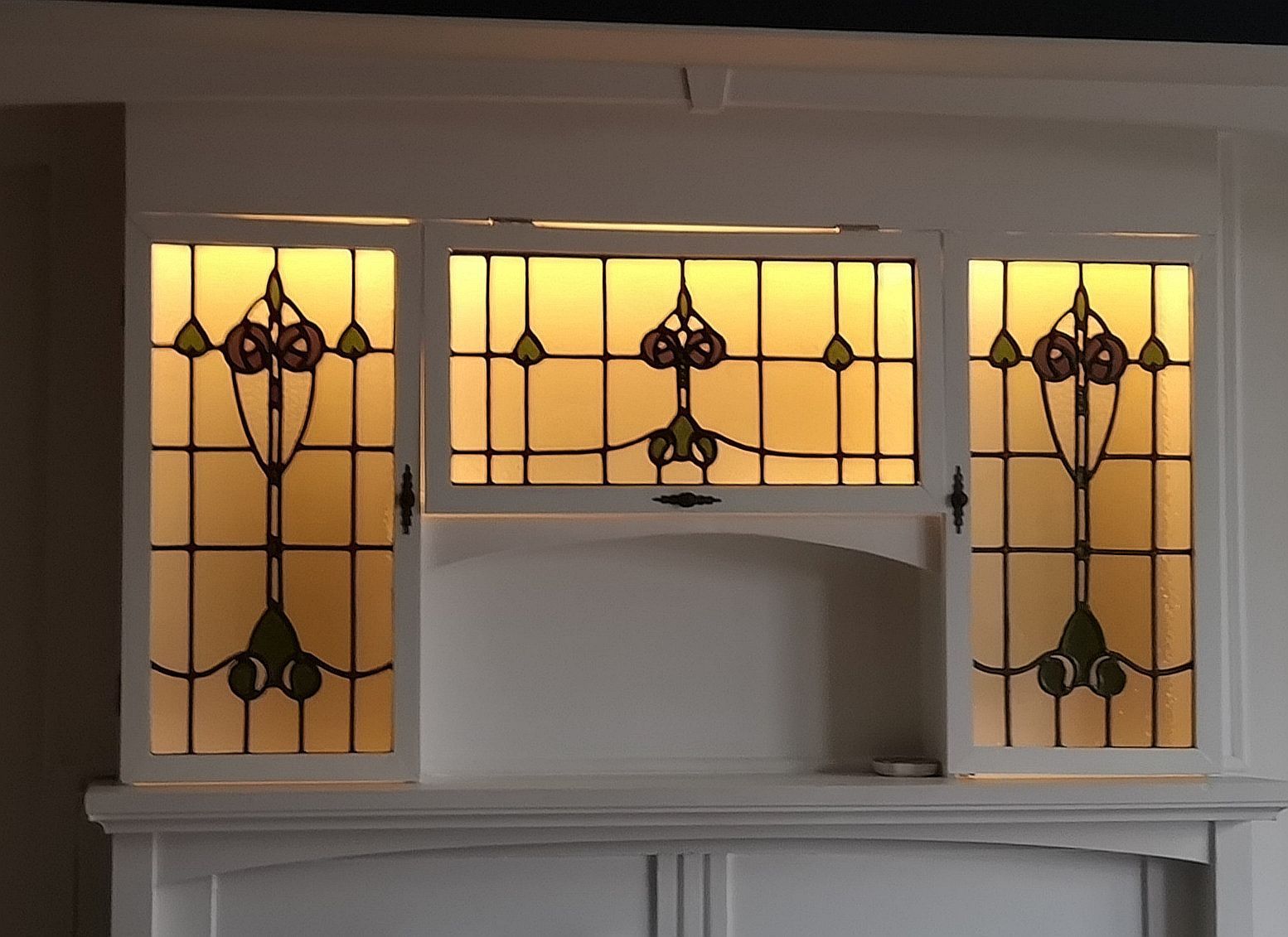 A set of Glasgow Style leaded glass panels for this stylish display cabinet for a fire surround / mantlepiece. Hyndland. Glasgow.