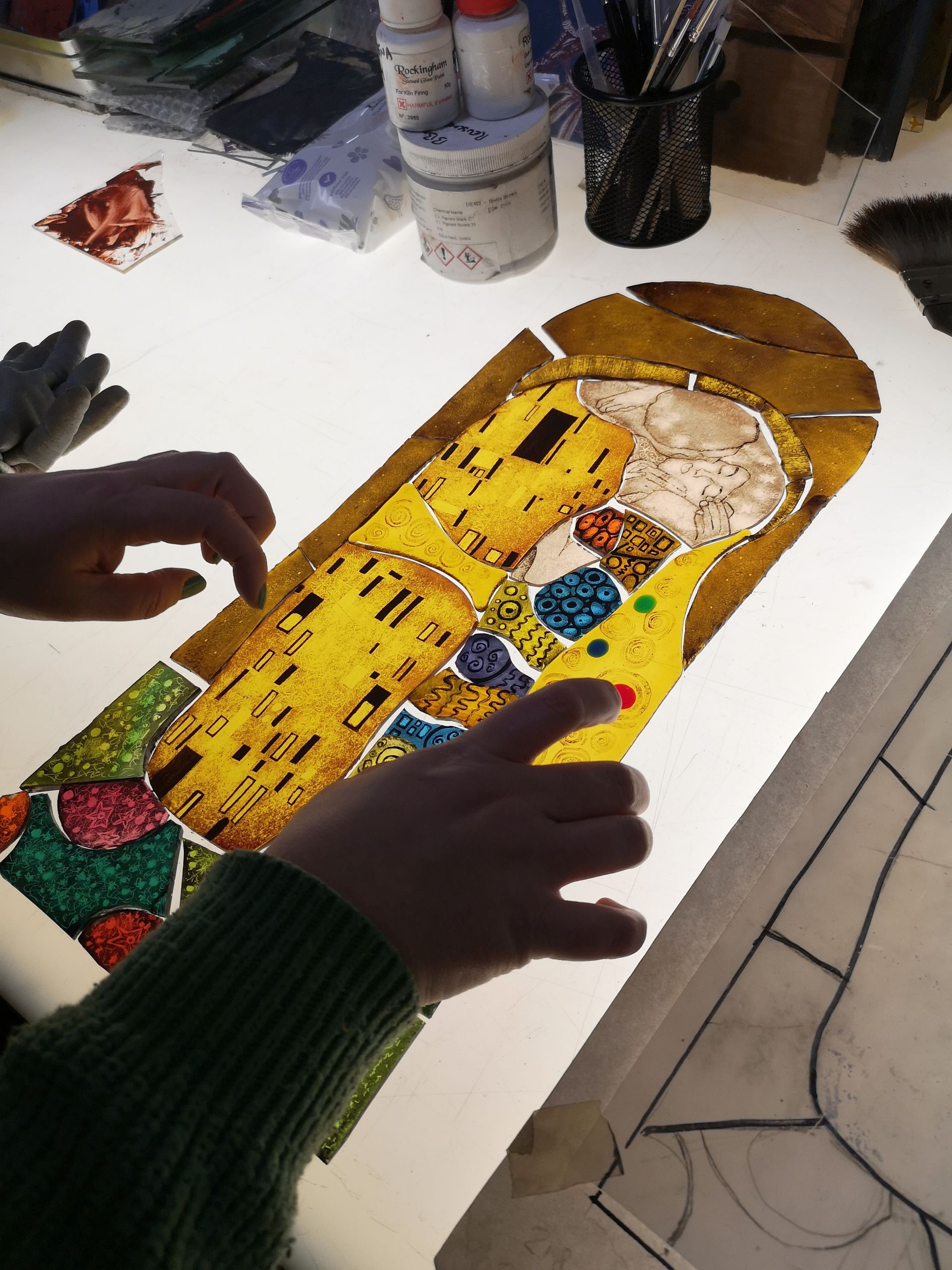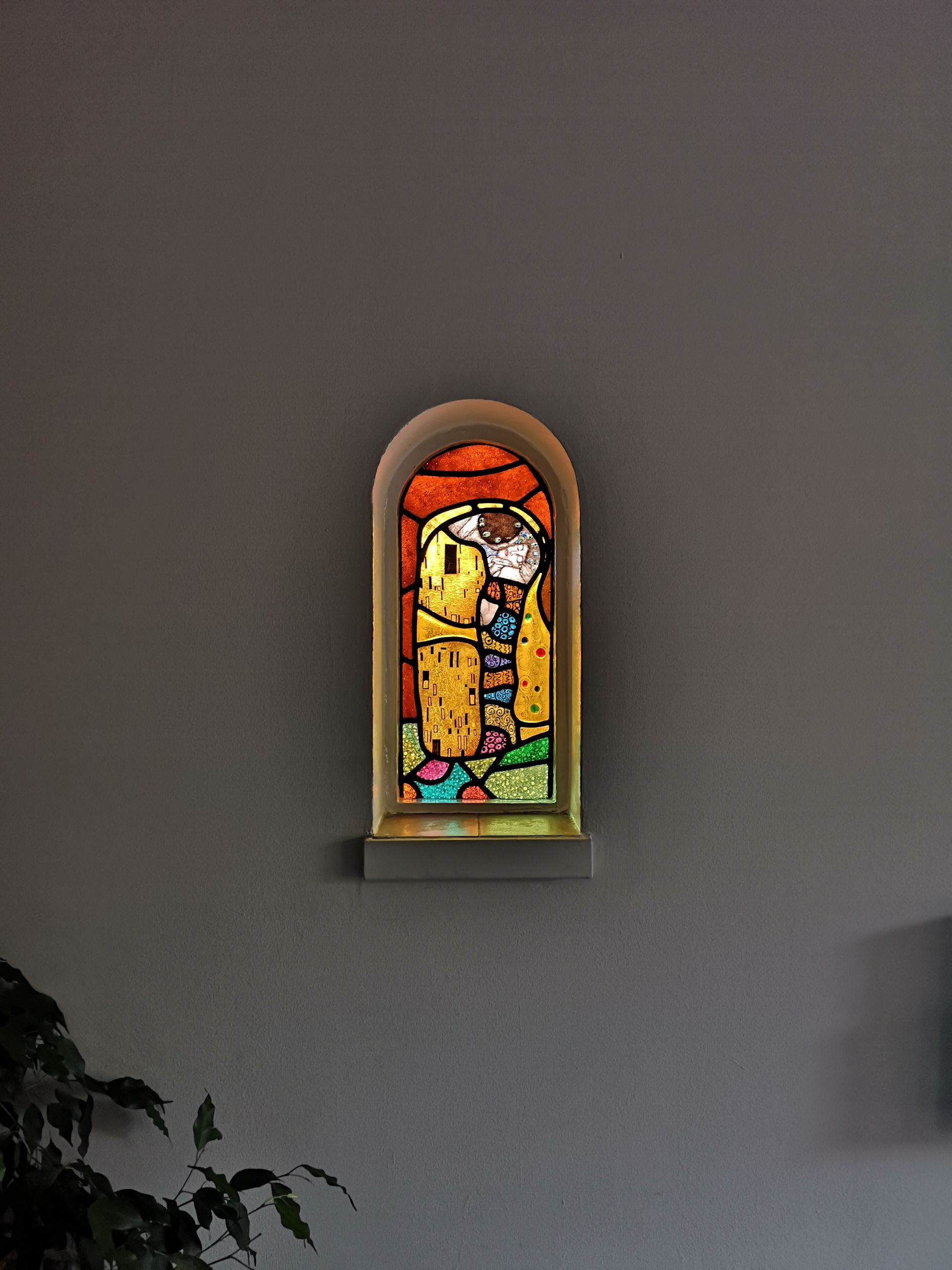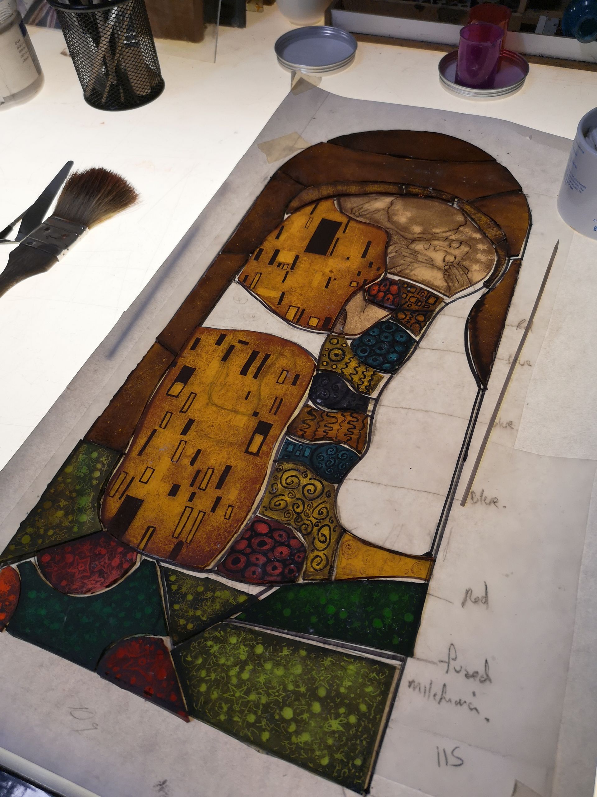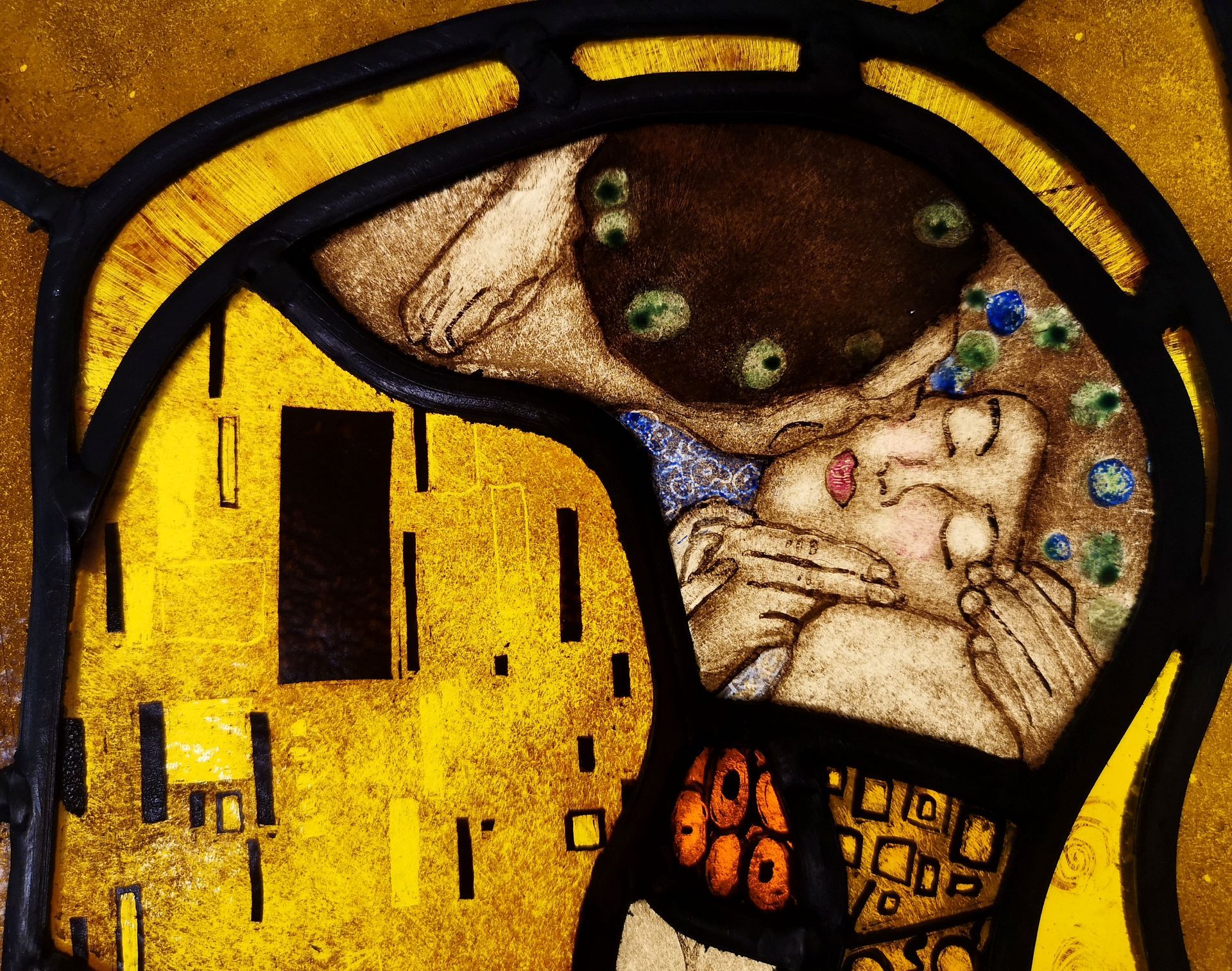 The Kiss. A Gustav Klimt inspired stained glass window. Fused glass and painted sections were used to help create the design. Glasgow, Scotland.
